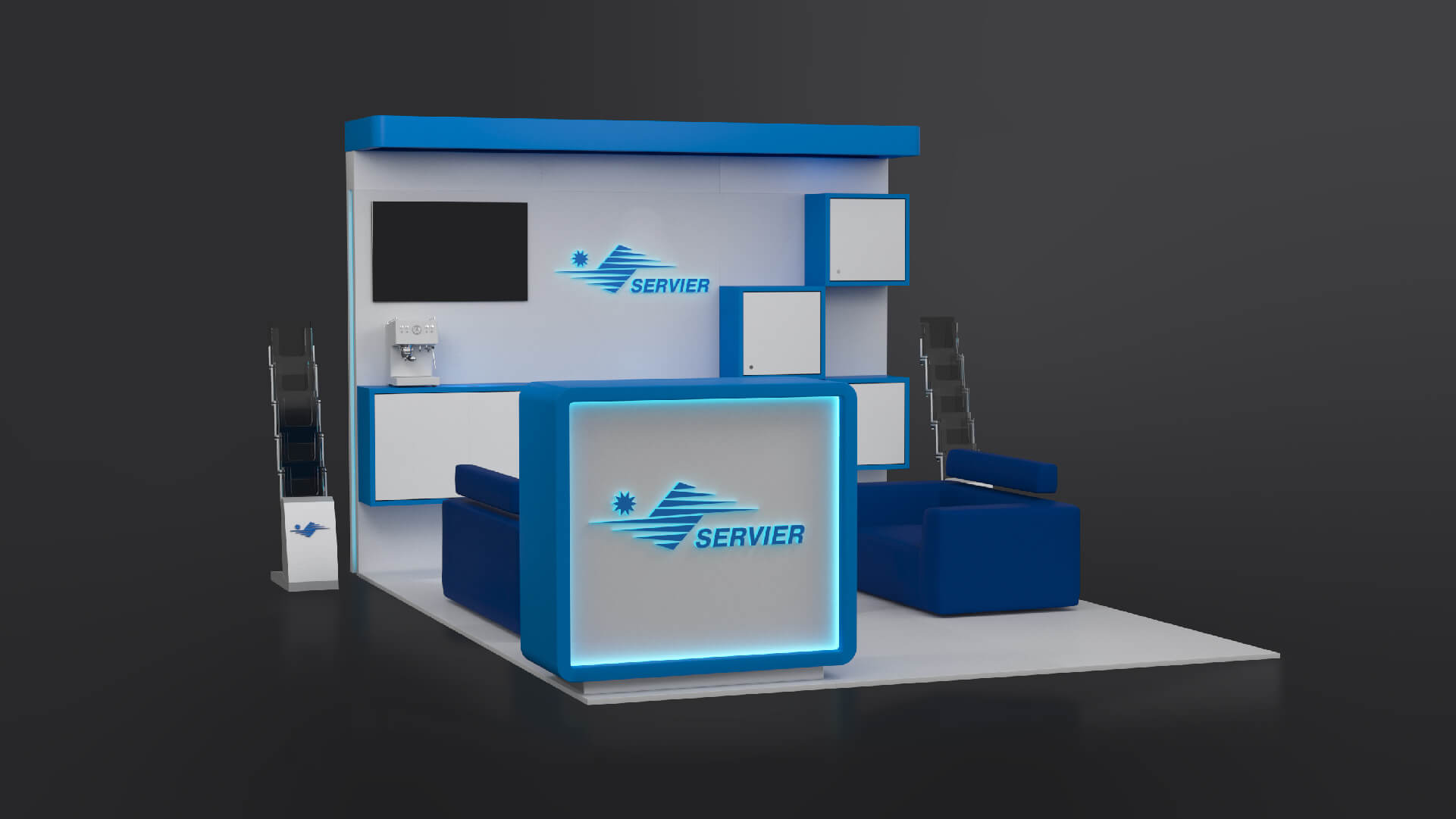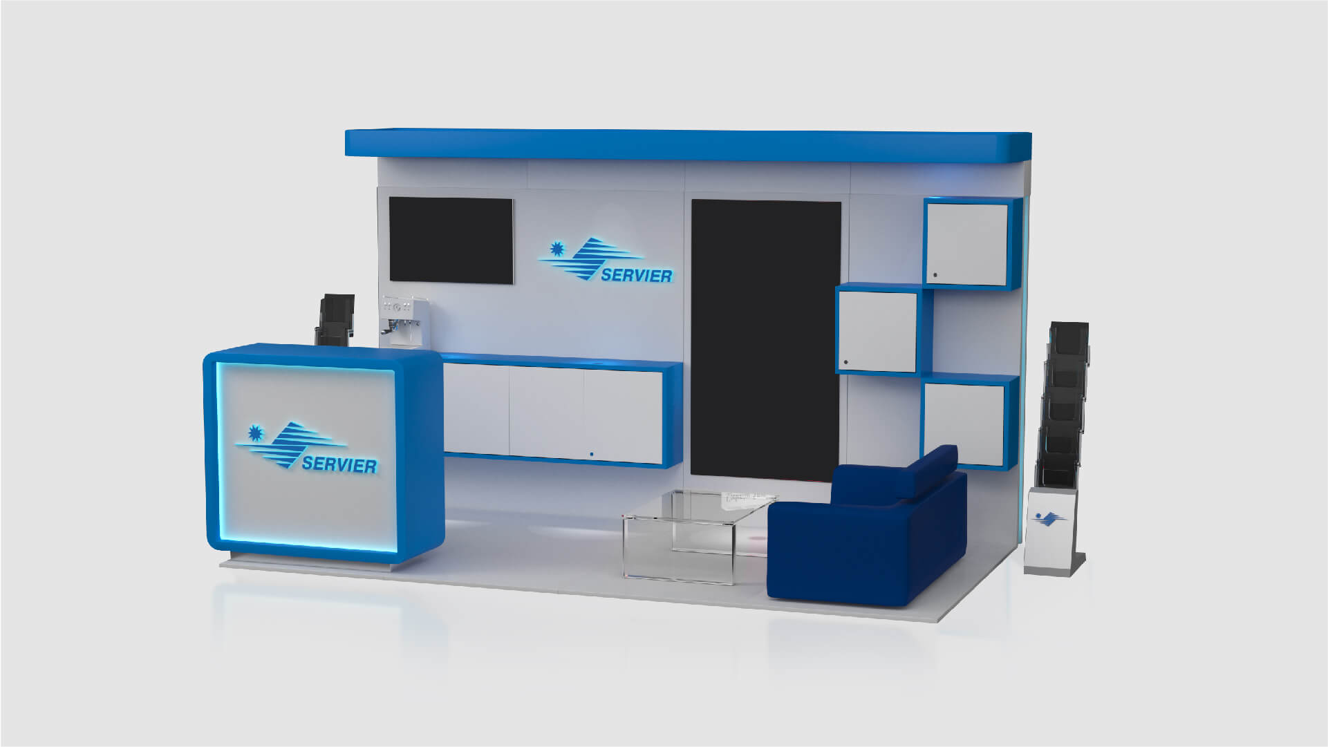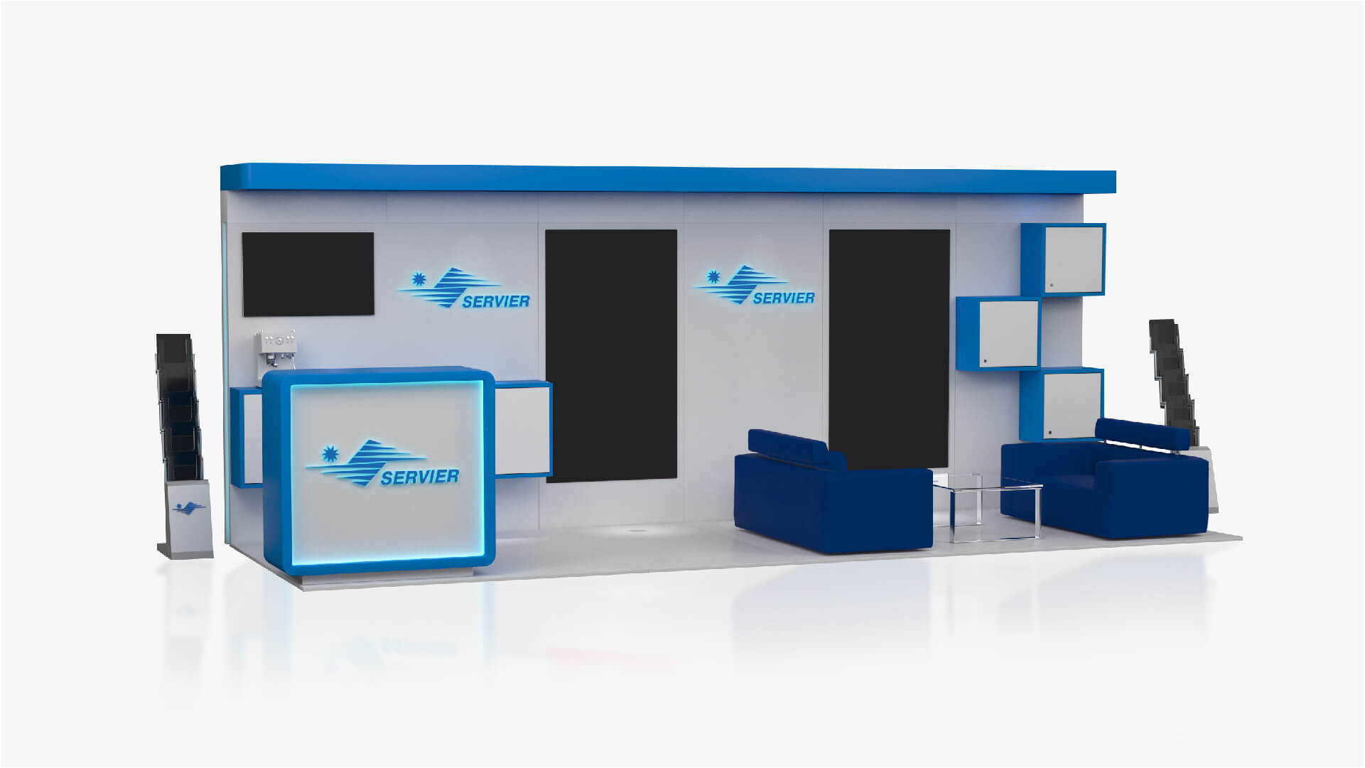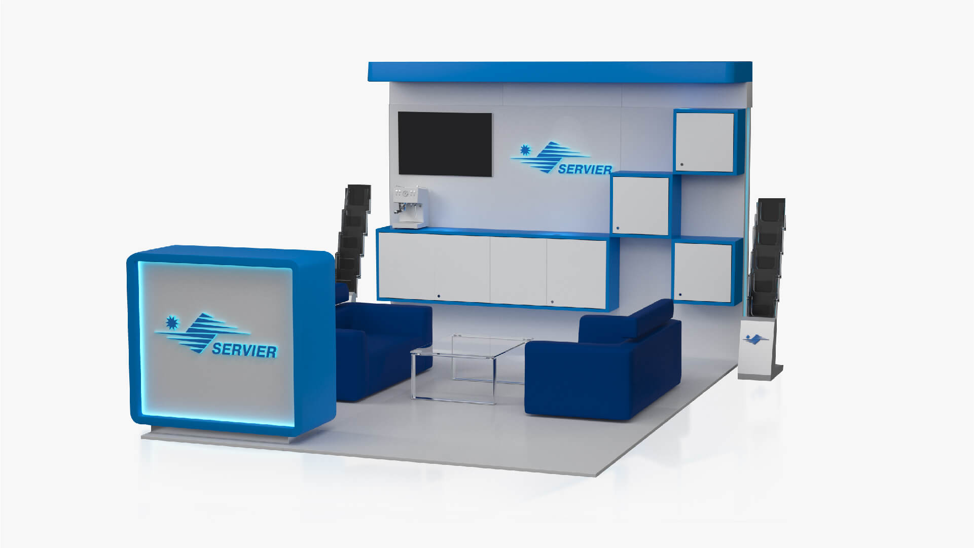 We got familiar with Servier's corporate design standards and then we started outlining our project development ideas. After two weeks of hard work, we presented our proposal for a modular exhibition stand to the client. It included the integration of 2 digital walls for presentation and an additional LCD TV, as well as a combination of luxury furniture, storage cabinets and a reception. We managed to fit all that in only 12 m2 and keep comfortable empty spaces on the stand in the same time.