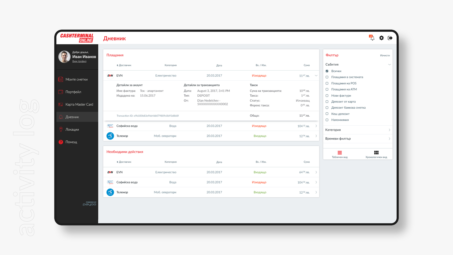 In der Zwischenzeit entwickelte unser Kreativteam das Interface für die mobile Applikation Cashterminal, die den Benutzern eine äußerst intuitive Anwendung bietet. Alle Funktionen sind schnell zugänglich und unverwechselbar, wobei die Bezahlung der Benutzerrechnungen im Mittelpunkt steht. Zu den einzigartigen Merkmalen der Anwendung gehört die Möglichkeit, online eine Bankkarte anzufordern und mit nur wenigen Aktionen Geld an einen Freund zu überweisen.