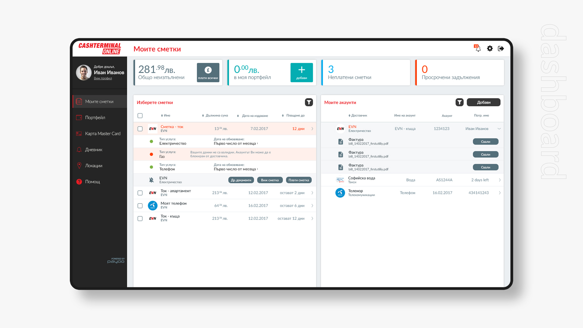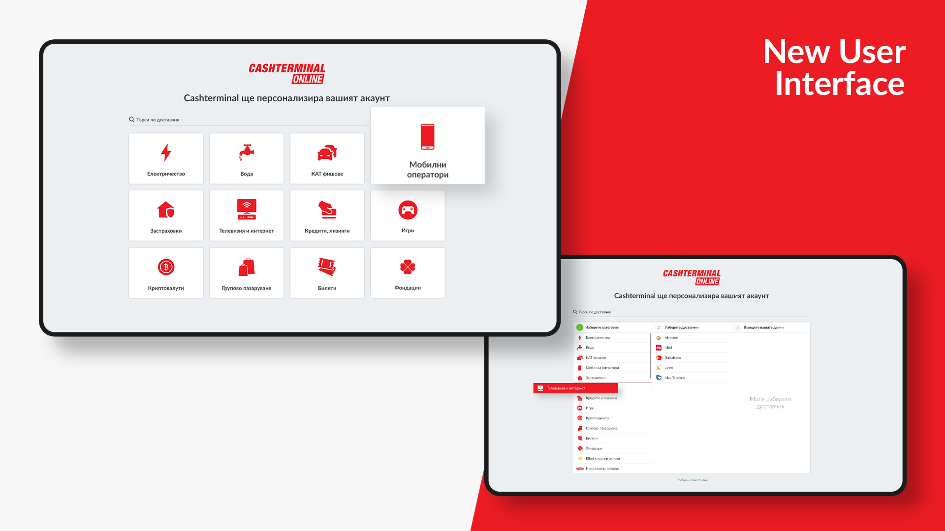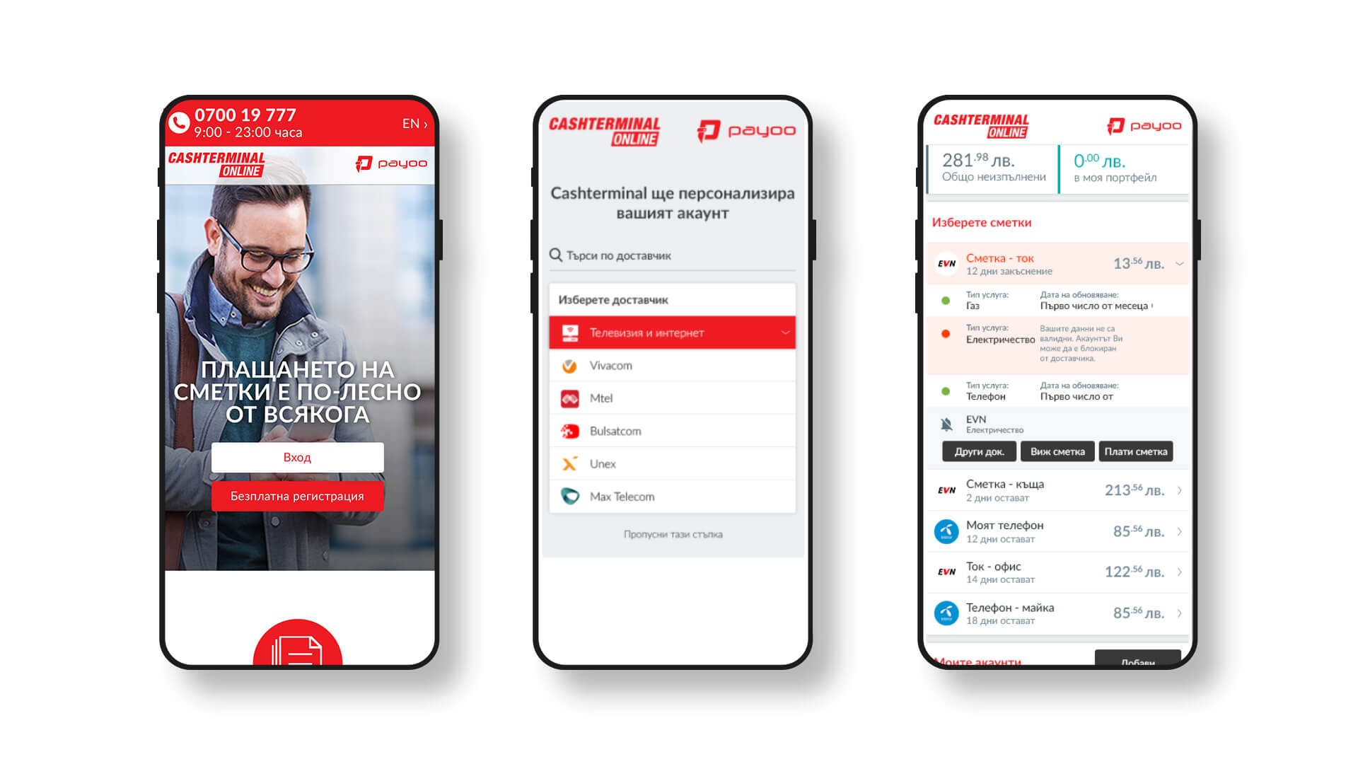 Cashterminal verfügt über das größte Netz an Kiosken für die Bezahlung von Rechnungen von Versorgungsunternehmen (Strom, Wasser, Telefon, Fernwärme), Kabelfernsehen, Internetanbietern sowie Bankkrediten, Leasing, Versicherungen usw. in Bulgarien.