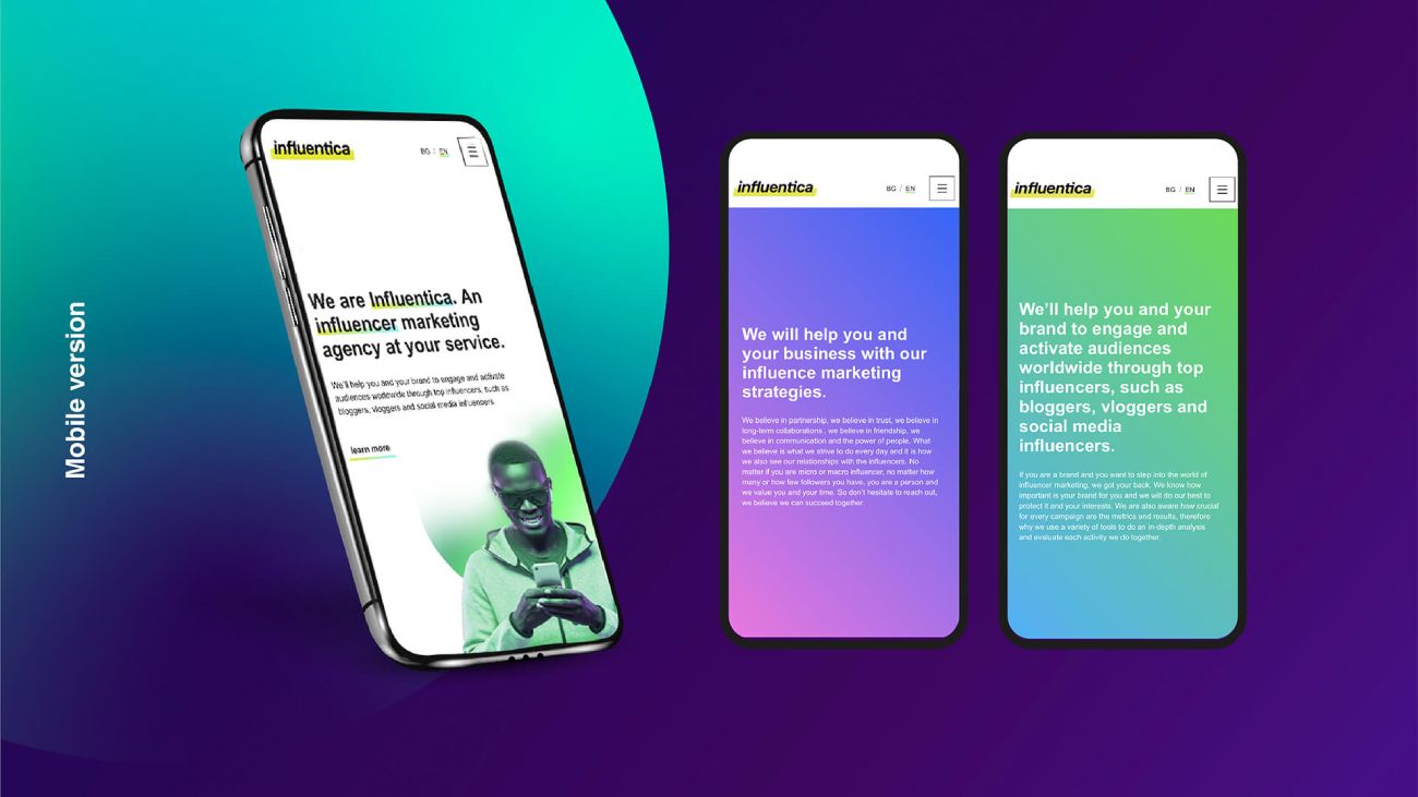 Nach einer Analyse des Influencer-Marketingfeldes und der Konkurrenzsituation in Bulgarien und Europa haben wir den Weg für eine erfolgreiche Marke vorgezeichnet. Wir haben mit einer kompletten Markenstrategie begonnen, die wir durch einen Markennamen mit farbenfrohem und einzigartigem Unternehmensdesign entwickelt haben. Schließlich entwickelten wir die Webseite unserer neu geschaffenen Marke - Influentica.