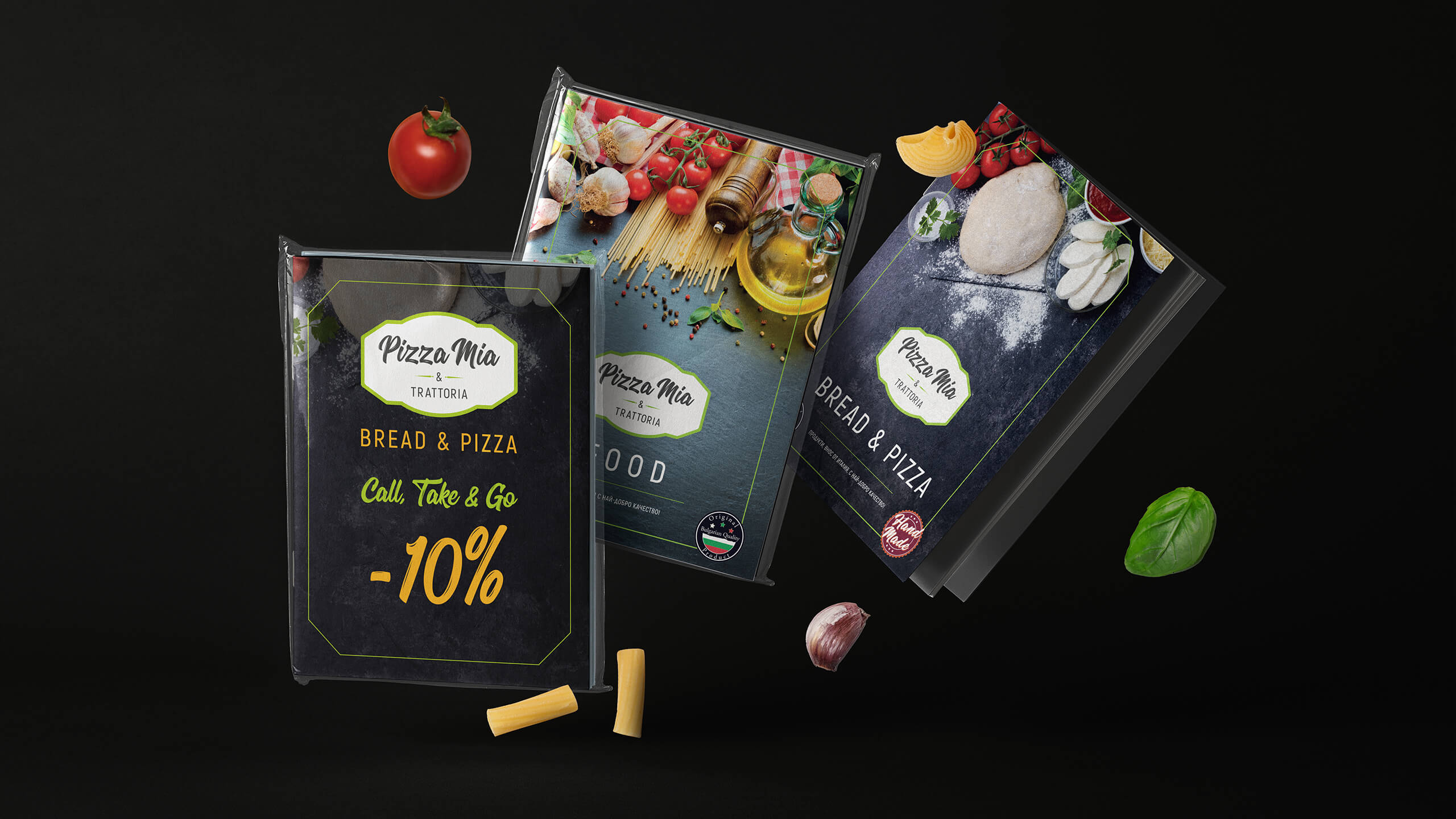 Wir haben mit unserer Arbeit begonnen, indem wir das Logo von Pizza Mia & Trattoria entworfen haben. Inspiriert von der italienischen Küche, entwickelten unsere Designer drei verschiedene Designkonzepte für das Logo. Für jedes Konzept wurden eine Reihe von Visualisierungen von Werbematerialien für das Restaurantgeschäft präsentiert. Nach der Auswahl des neuen Logos beauftragte uns Pizza Mia & Trattoria mit dem Entwurf und der Produktion von Druckmaterialien für das Restaurant. Wir organisierten eine Produktfotosession der angebotenen Gerichte und stellten die Fotos in der Speisekarte des Restaurants dar. Im Laufe der Zeit entwickelten wir mehrere Speisekarten und Broschüren für das Restaurant sowie zusätzliches Werbematerial für das Interieur.